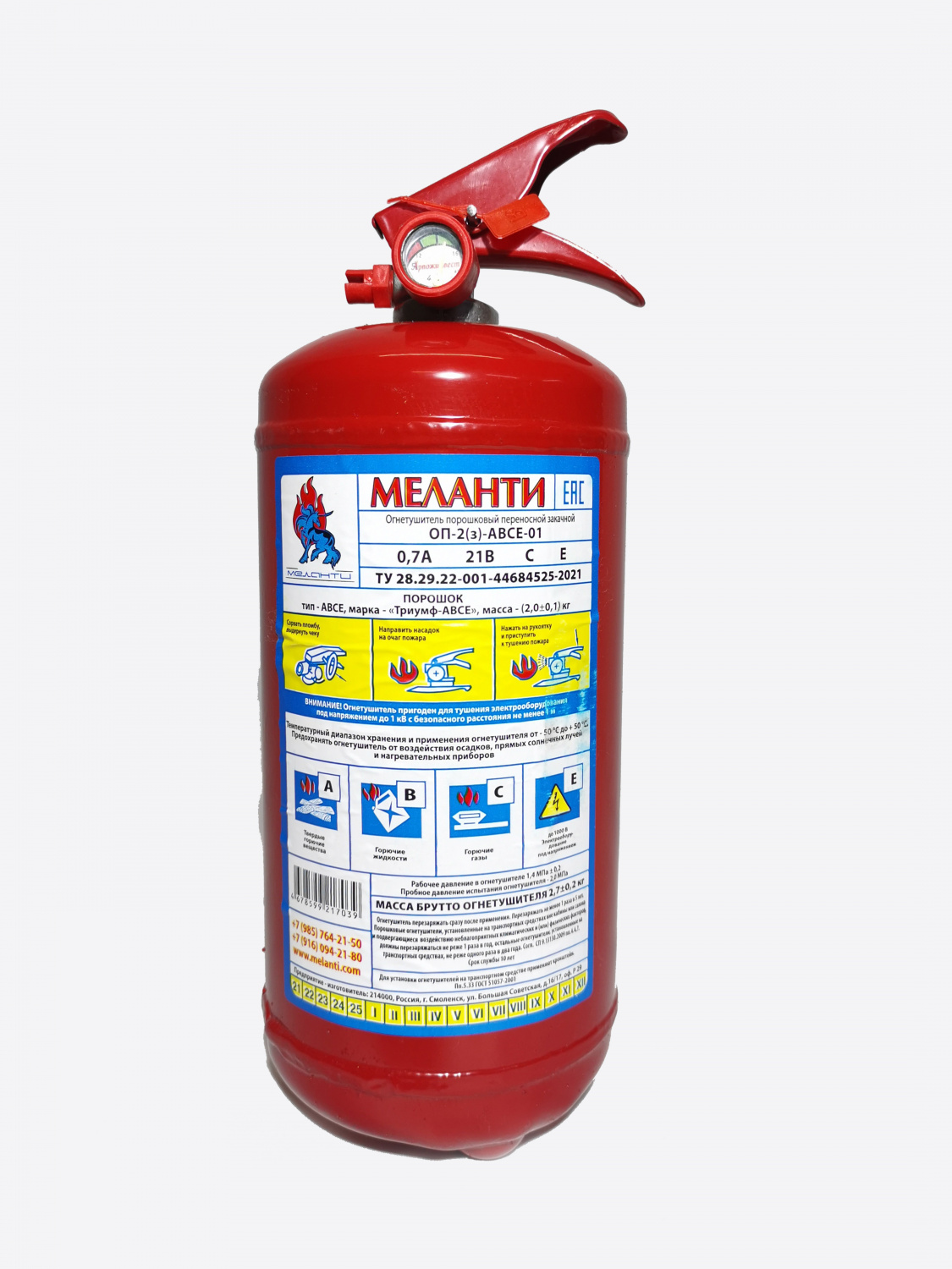 Огнетушитель предназначен для тушения очагов возгорания твердых горючих (класс «А»), легковоспламеняющихся и горючих жидкостей (класс «В»), горючих газов (класс «С») в рабочих и жилых помещениях, на транспорте, открытом пространстве, в том числе без отключения электроснабжения промышленной частоты с фазным напряжением до 1000 В.
